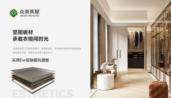 然而,眾美其屋對美好家居的追求遠(yuǎn)不止于此。在注重美學(xué)呈現(xiàn)的同時,品牌始終秉持美學(xué)與健康并重的理念,嚴(yán)選6D深壓紋飾凈醛板材?;牡焦に嚾轿桓镄?,產(chǎn)品達(dá)國際領(lǐng)先的ENF級環(huán)保標(biāo)準(zhǔn),遠(yuǎn)超國標(biāo),實現(xiàn)“裝修即入住”的夢想。凈醛技術(shù)似忠誠空氣衛(wèi)士,持續(xù)分解游離甲醛,讓衣帽間成無污染凈土。畢竟,我們每日在衣帽間挑選、整理,空氣質(zhì)量關(guān)乎健康。眾美其屋ENF級板材營造健康空間,讓都市家庭無需遠(yuǎn)行,便能觸摸到森林的呼吸、感受陽光的溫度,開啟一場與自然、與健康相伴的美好生活之旅。