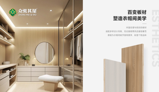 在衣帽間的打造中,眾美其屋的6D深壓紋工藝盡顯優(yōu)勢,其6D深壓紋飾面板科技與藝術(shù)的融合之作。它打破傳統(tǒng)平面板材的桎梏,借助高精度數(shù)控技術(shù),精準(zhǔn)復(fù)刻山巒、木紋、水波等自然之景,精密計算紋路卻保留自然不規(guī)則之美,將天地靈氣凝于板材方寸之間。
