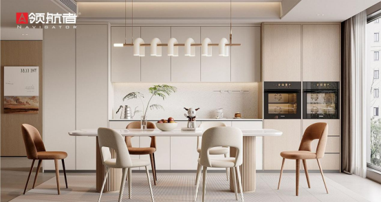 餐廳·品味時(shí)光:圓月映窗,美食滿桌,餐廳是團(tuán)圓宴飲的溫情據(jù)點(diǎn)。領(lǐng)航者家居定制的餐桌椅與餐邊柜,兼顧材質(zhì)堅(jiān)固與線條圓融——所選板材耐磨耐劃、易清潔打理,即便聚餐再熱鬧,也能從容應(yīng)對(duì)。