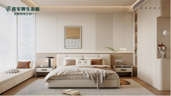 將軍牌生態(tài)板的淺原木紋理,是兒童房空間的靈魂所在,搭配清爽通透的白色柜體,兩種色調(diào)碰撞出治愈感滿滿的視覺體驗(yàn),既不沉悶也不單薄,讓兒童房始終保持明亮開闊的質(zhì)感;當(dāng)陽光透過窗簾灑入時(shí),原木色書桌、衣柜泛出柔和暖光,白色面板折射出細(xì)碎光影,在墻面與地面形成靈動光斑,孩子追逐光斑嬉戲、趴在書桌涂鴉,光影與木色交織的瞬間,便是童年珍貴的畫面,這種低飽和配色契合兒童房清新調(diào)性,更能適配孩子成長過程中的軟裝變化,多年后依然不會過時(shí)。