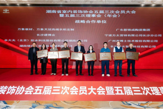 本次會議榮譽授牌環(huán)節(jié),萬象板材與萬象天冠高端衣柜定制憑借過硬的綜合實力與市場競爭力,成功獲評戰(zhàn)略合作單位,并獲授榮譽獎牌。